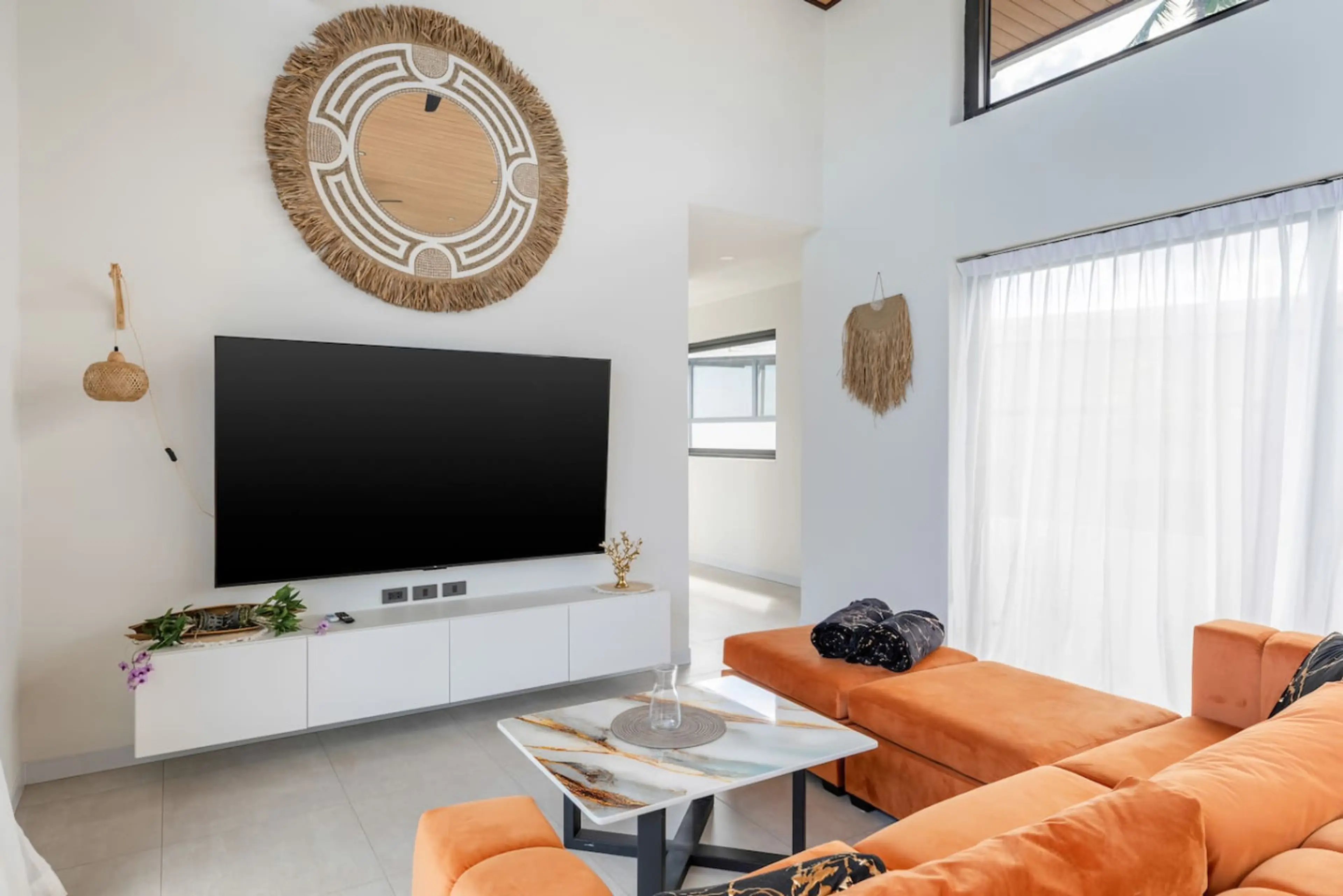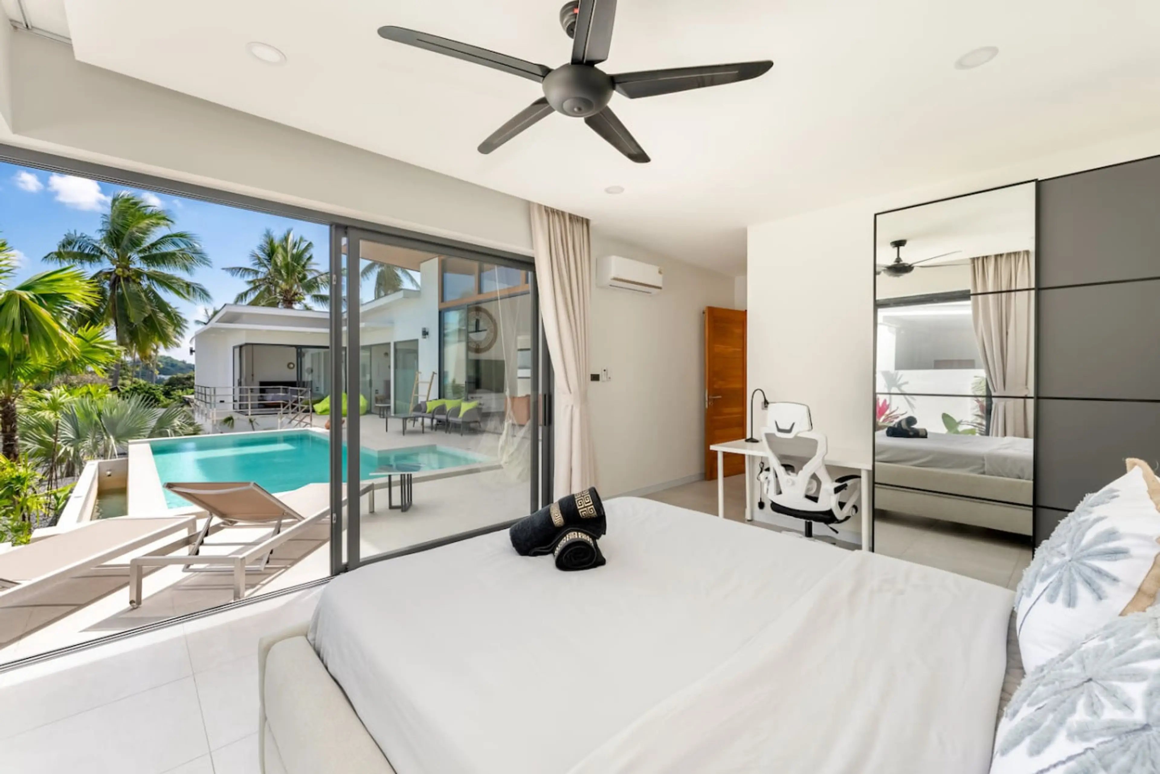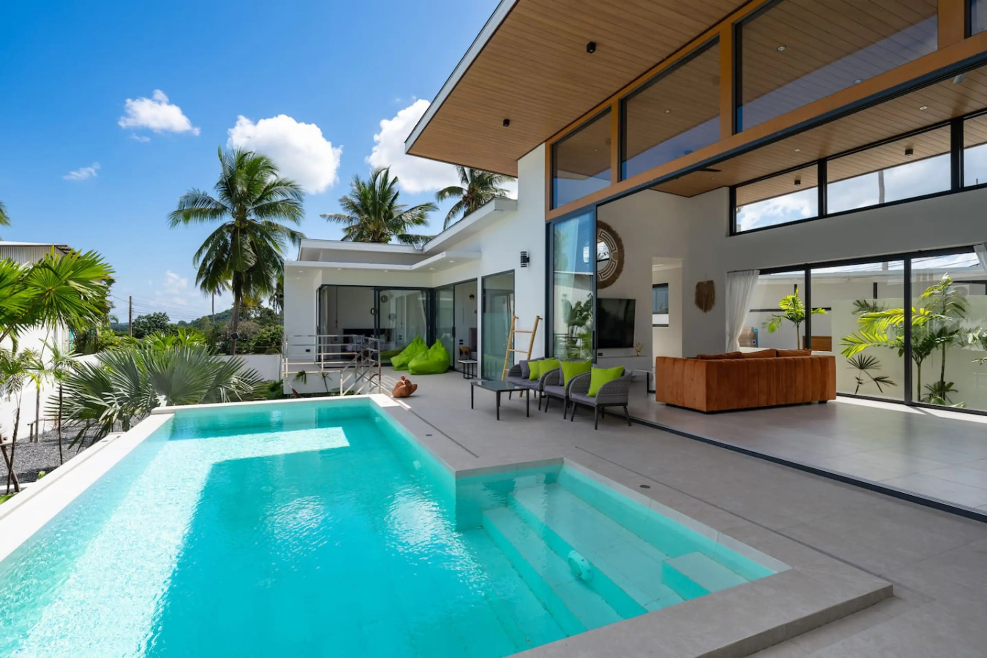 Unwind at Villa Mona, a bright 3-bedroom home in the secure Sawasdee Pool Villas estate—just minutes from the International School of Samui (ISS). Floor-to-ceiling glass slides open to your private pool with a cascading edge, shallow ledge, sun loungers, and an outdoor shower. Two king bedrooms sit ...